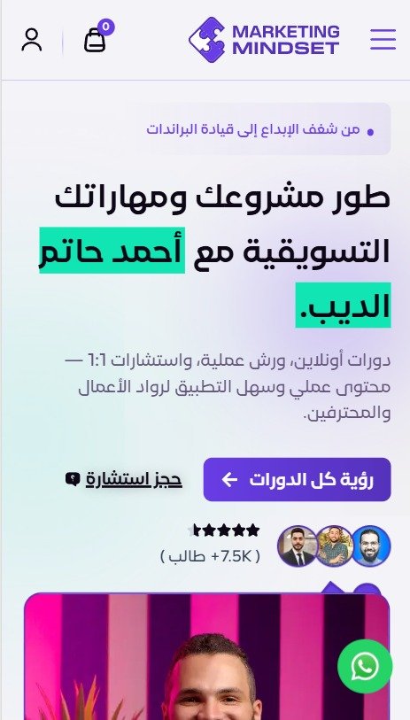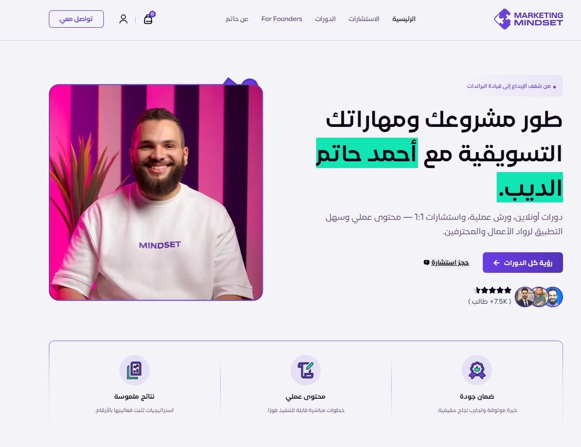 A fully Arabic LMS and personal branding platform built for marketing expert Ahmed Hatem Eldib. The site features online courses, 1:1 consultation booking, and a complete e-commerce system for digital products — all optimized for RTL Arabic audiences.