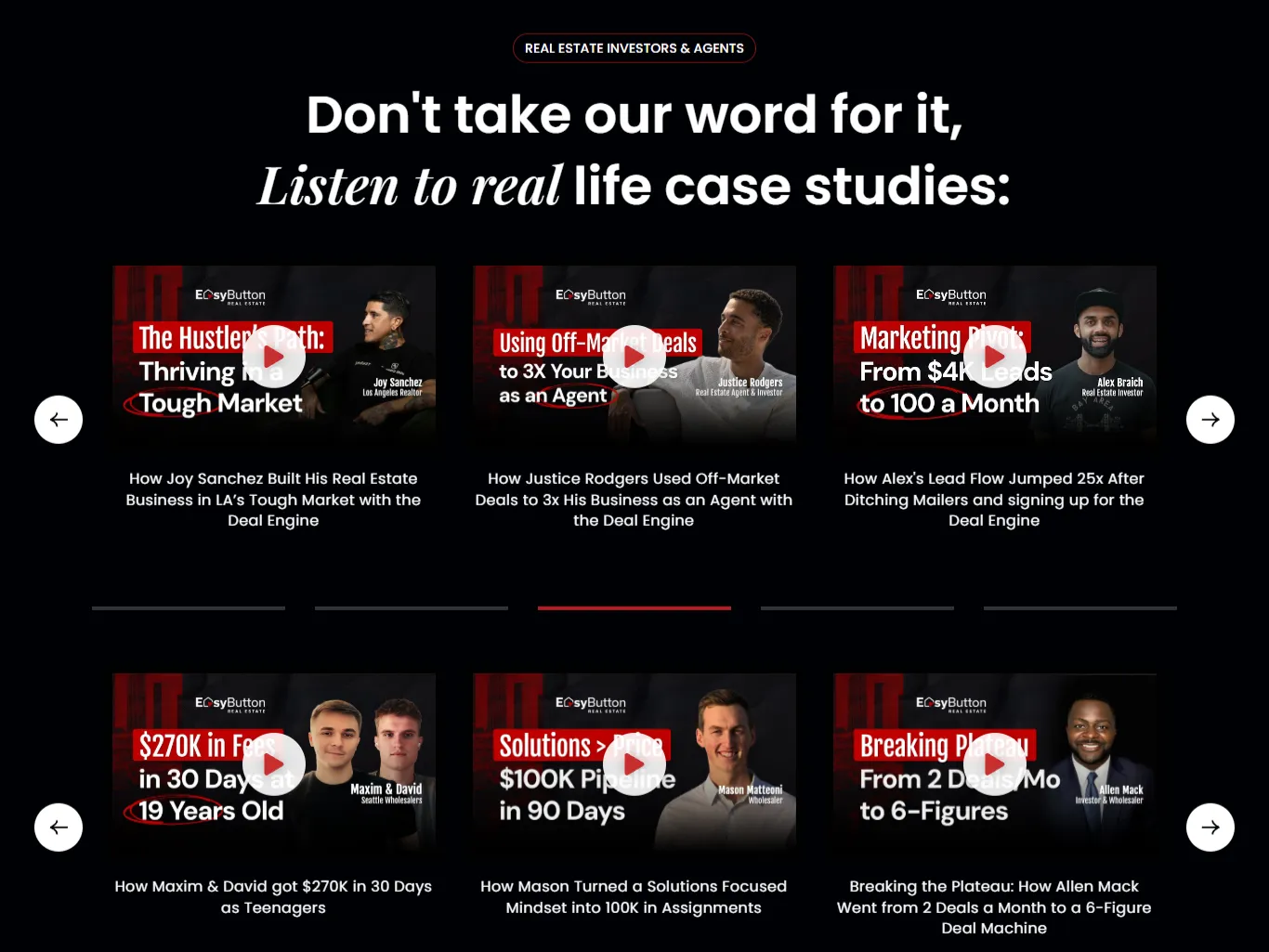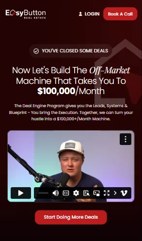 EasyButton Real Estate needed a powerful landing page to promote their “Deal Engine” program β a comprehensive coaching and lead generation service for real estate investors and agents looking to scale to $100,000/month.