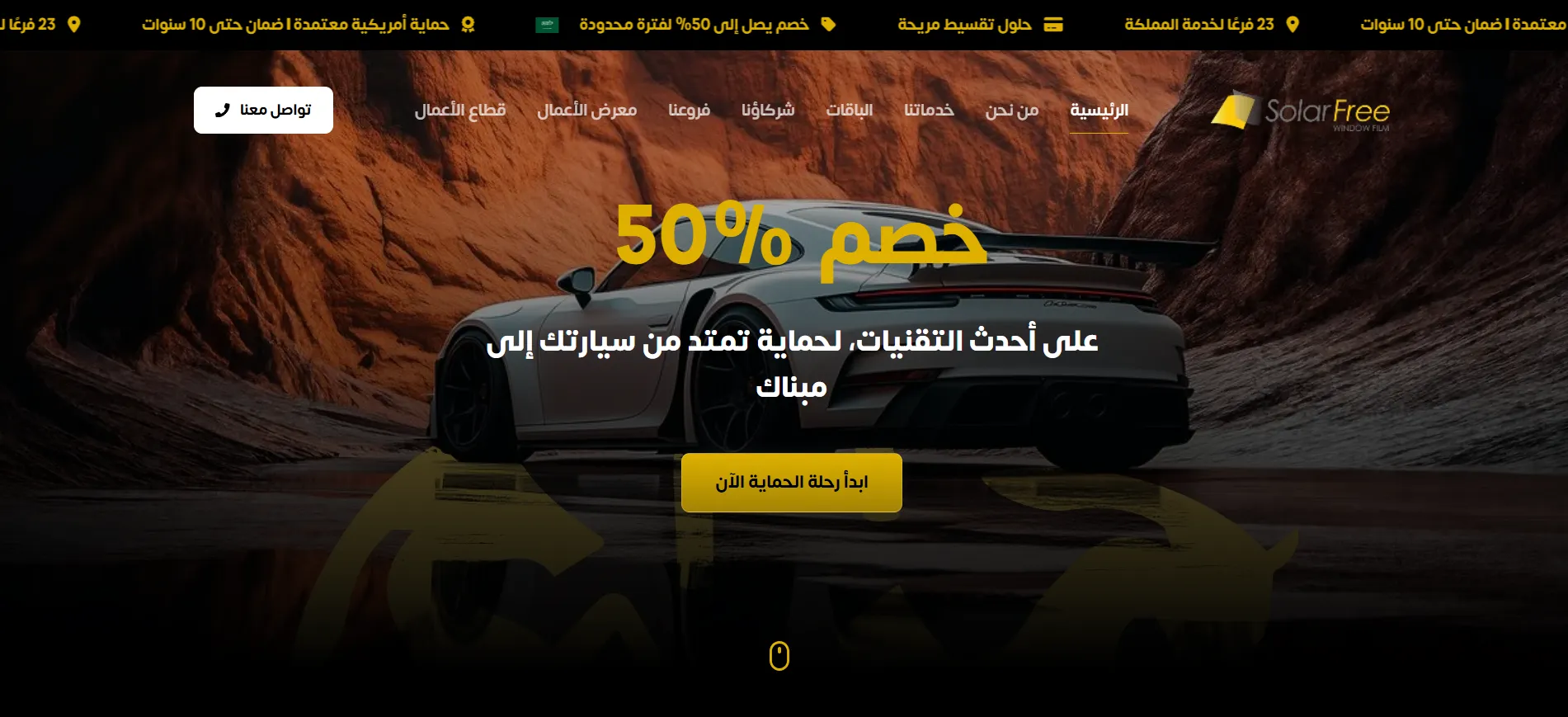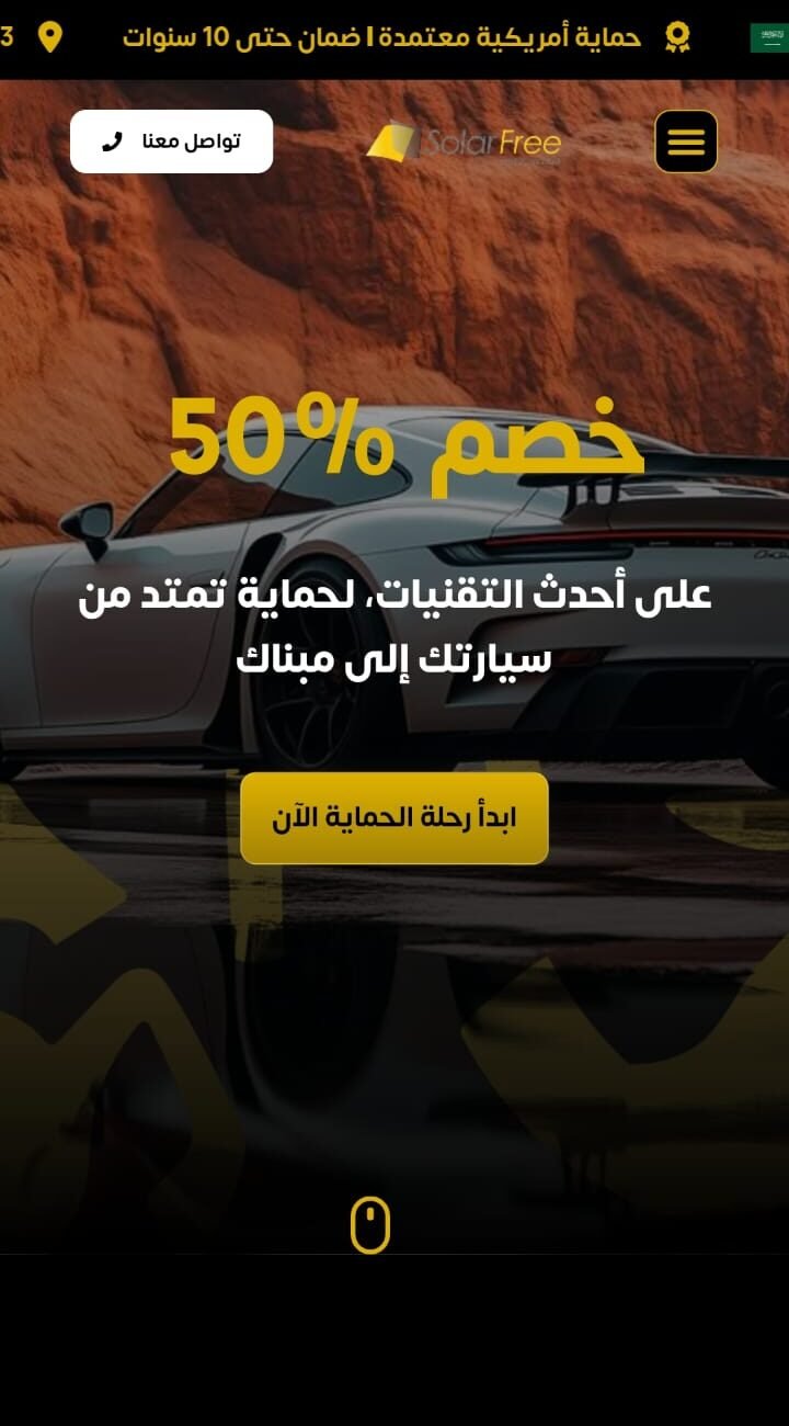 Solarfree is a WordPress website for a Saudi Arabian company specializing in vehicle and building protection solutions using American technologies. The site showcases thermal insulation films, PPF, and nano-ceramic coatings across 23 branches with WhatsApp and Google Maps integration.