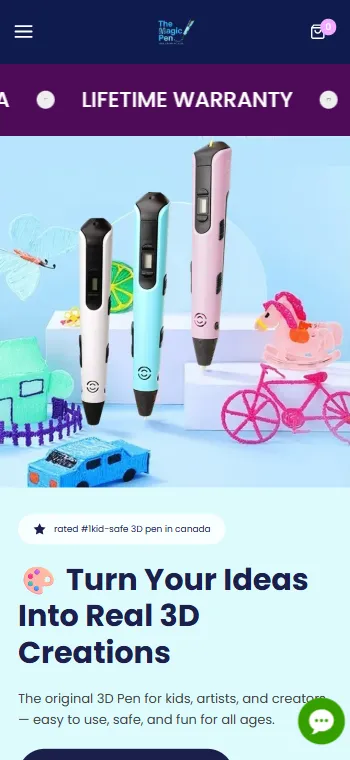 The Magic Pen is a Shopify eCommerce store selling creative 3D pens for kids, artists, and creators in the Canadian market. The site features motion animations, WhatsApp chat integration, and Judge.me reviews, positioned as the #1 kid-safe 3D pen brand in Canada.